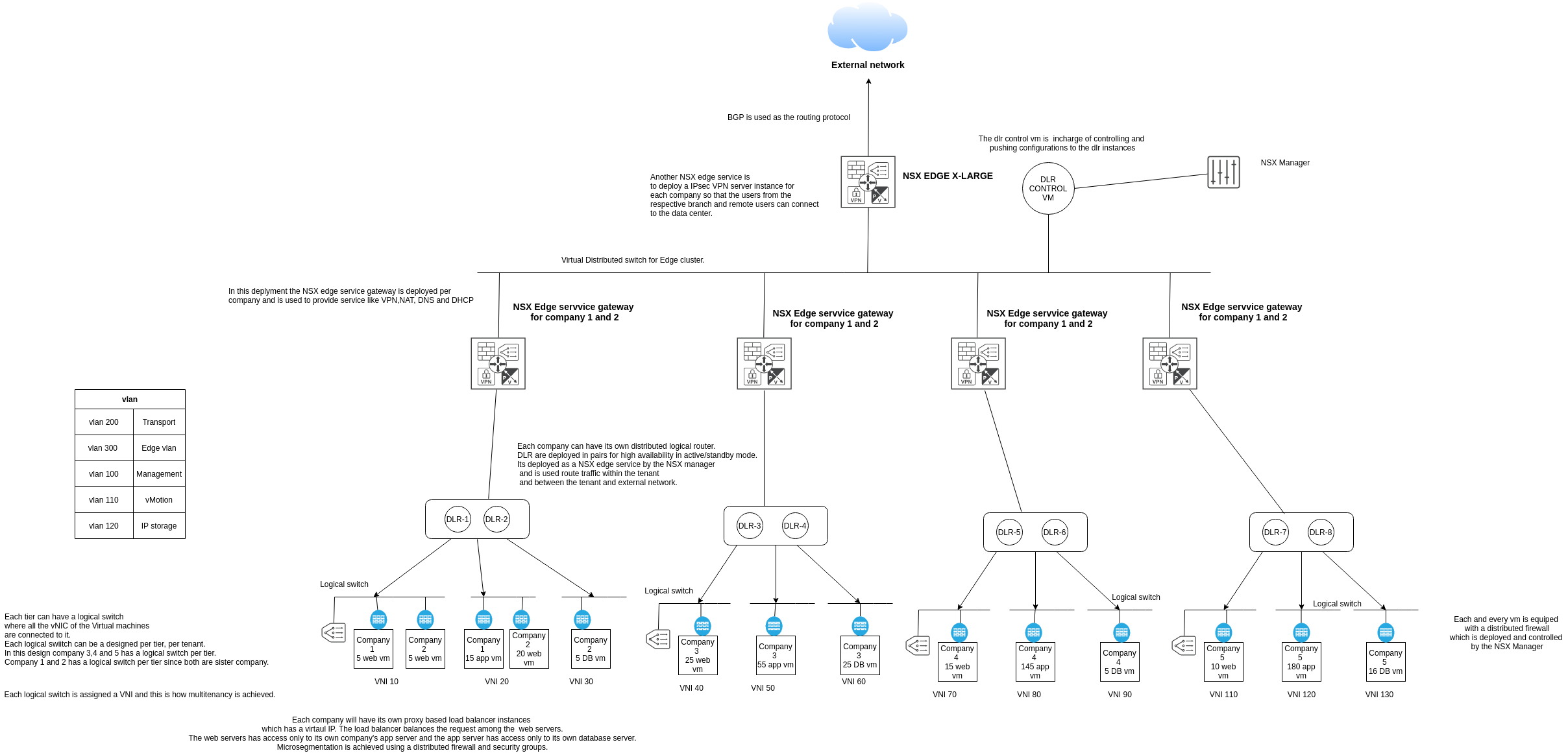 The logical topology leverages VMware NSX to achieve multi-tenancy and microsegmentation. Each company is provided with its own network services, including load balancers and distributed logical routers. Logical switches with unique VNIs segregate traffic, allowing for per-tier or per-tenant network designs. Secure access for remote users and branches is facilitated through NSX Edge services, deploying IPsec VPN instances per company.
